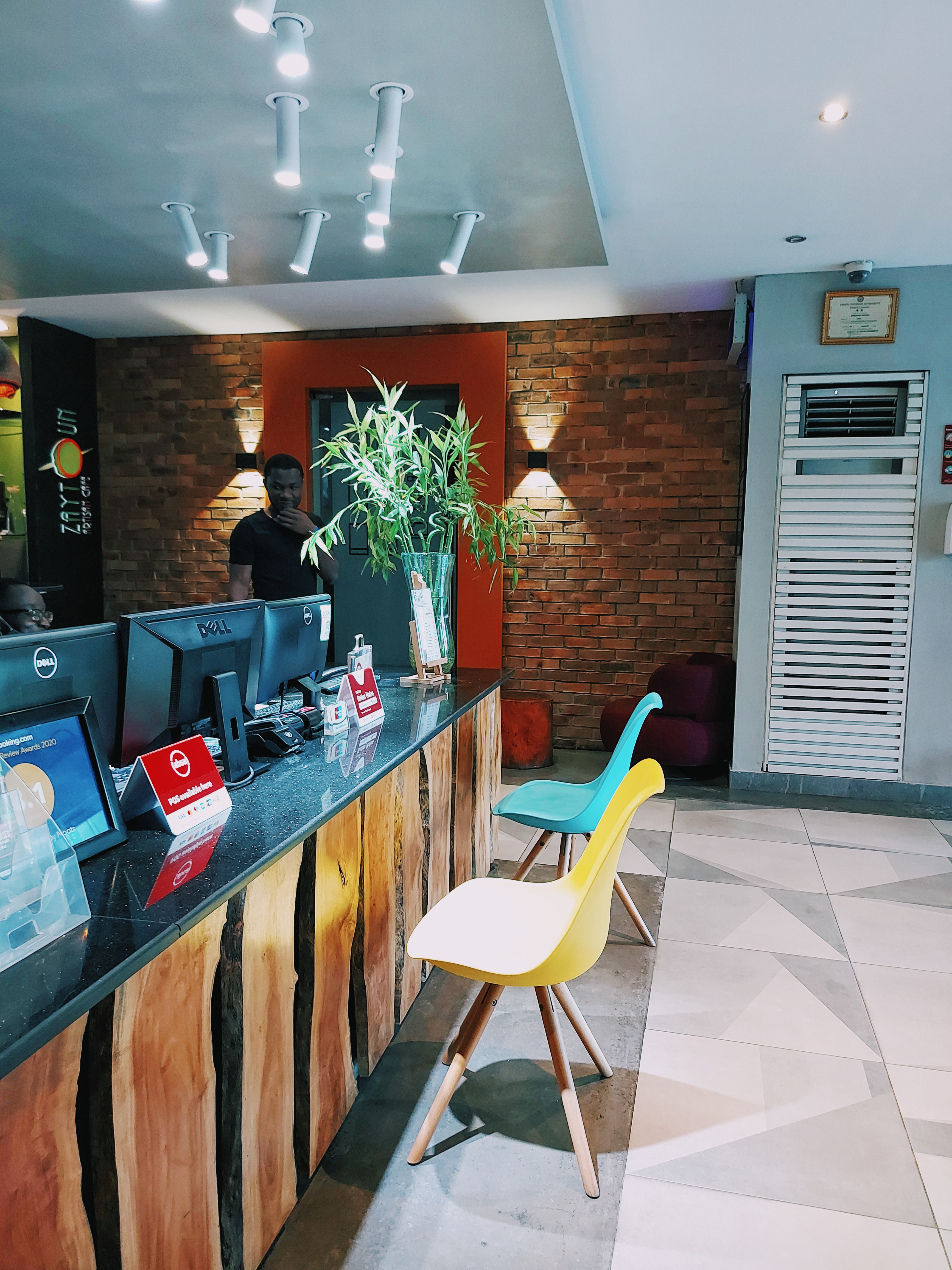 J’ai été accueillie à l’aéroport par leur navette et environ 15 minutes plus tard je faisais mon check in. La réception et sa et sa petite déco très colorée, l’équipe très charmante m’ont tout de suite mis à l’aise. Je me suis ensuite rendue dans ma chambre (studio) spacieuse, joliment décoré et avec une très jolie douche. Toutes les chambres sont climatisées, détails importants à Accra.