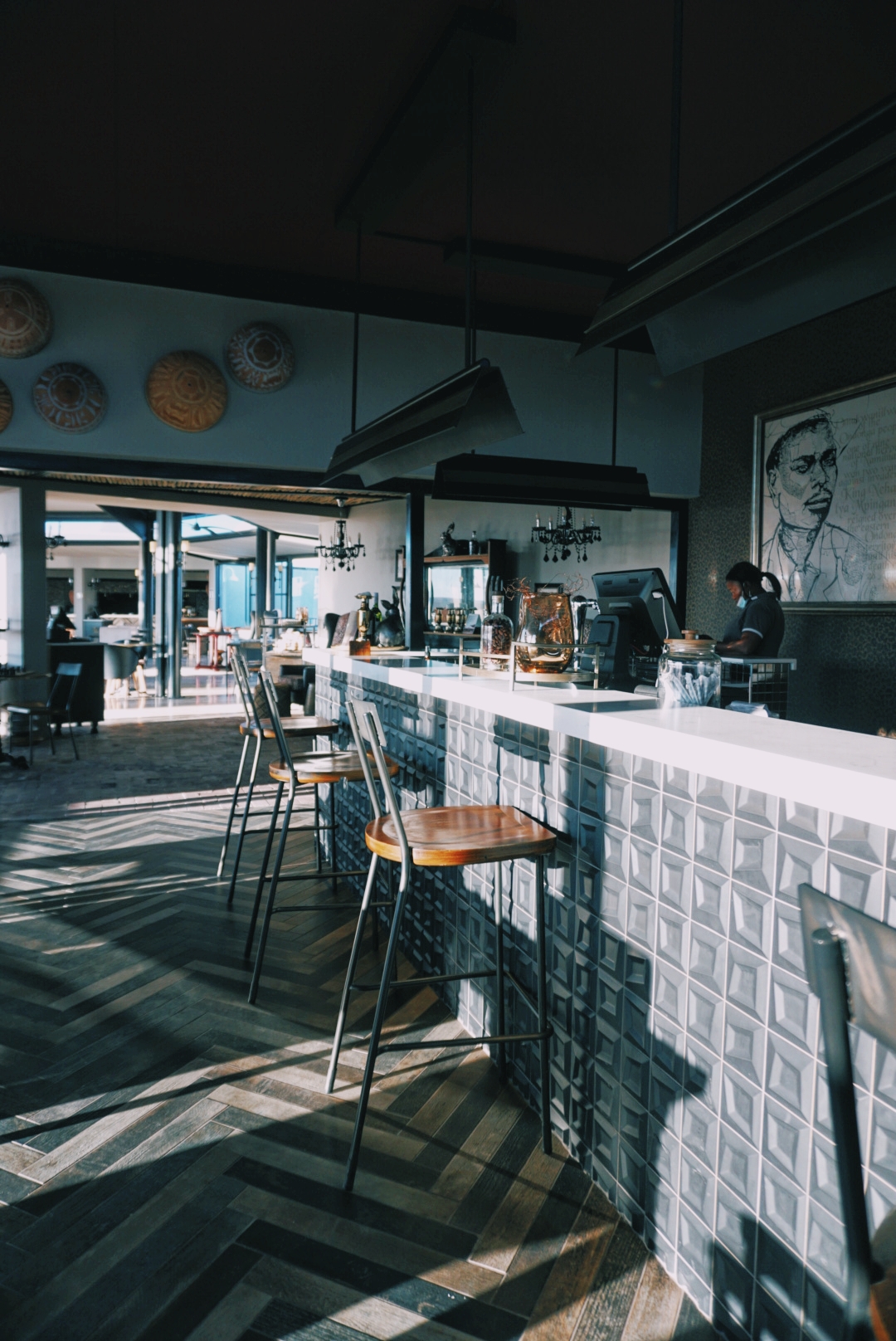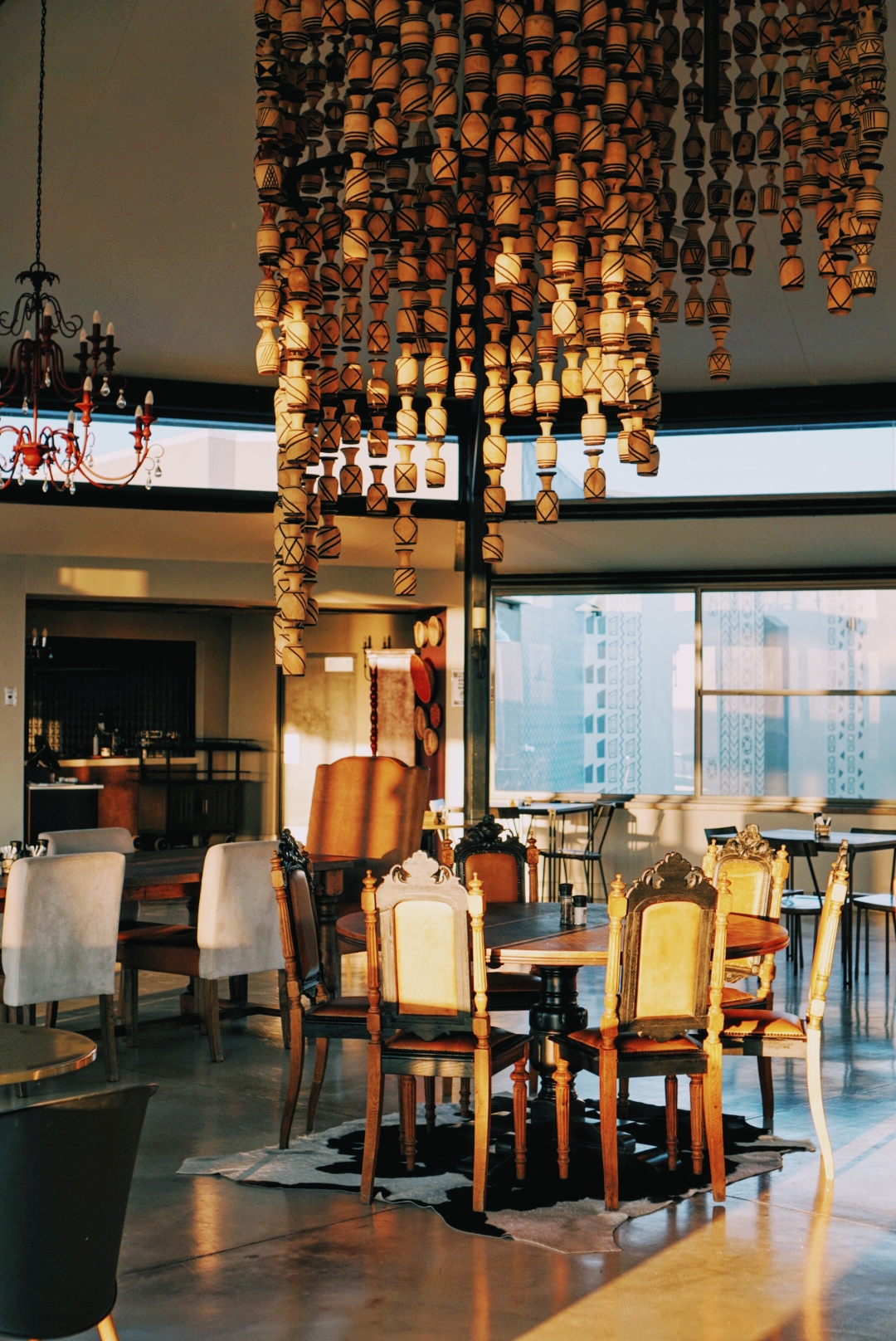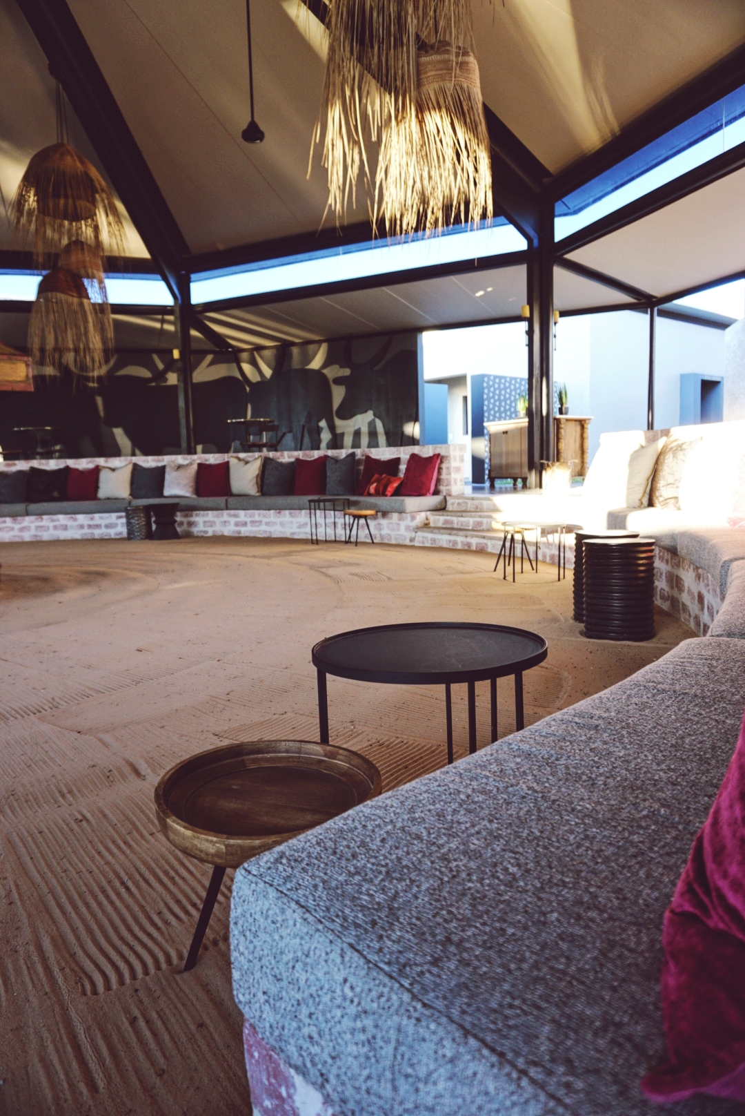 Le restaurant, le bar et la réception sont au centre du lodge. Comme pour les chambres, tous les détails sont un hommage à la culture Owambo. Le lustre est composé de coupes en bois gravé , la vache est représentée de plusieurs façons dans les meubles, les tons sombres sont contrastés grâce aux très larges baies vitrées et la vue vous permettra d’admirer le coucher du soleil tous les soirs!
