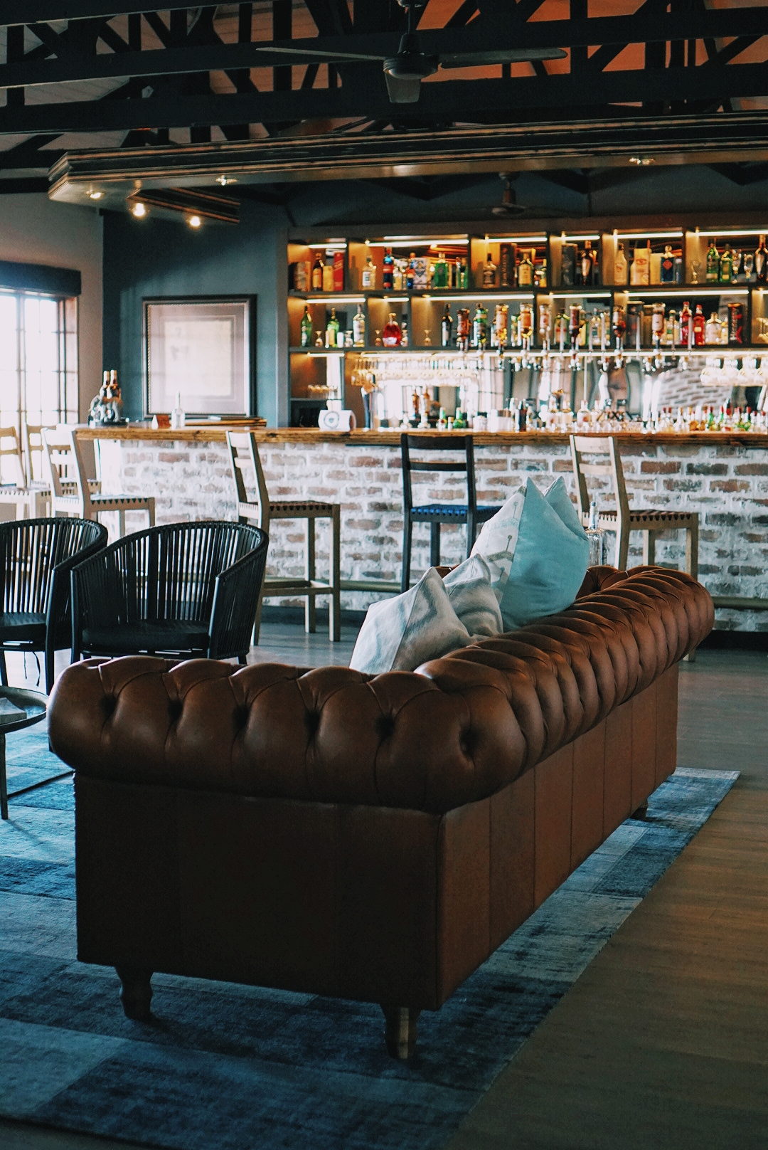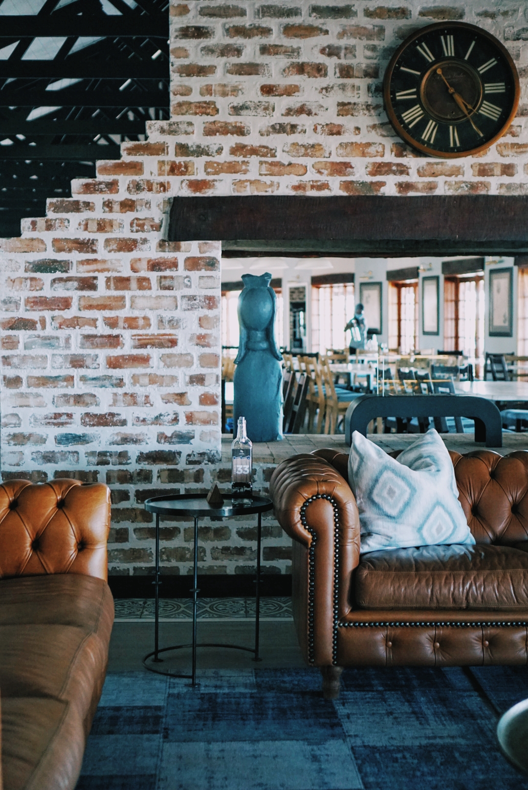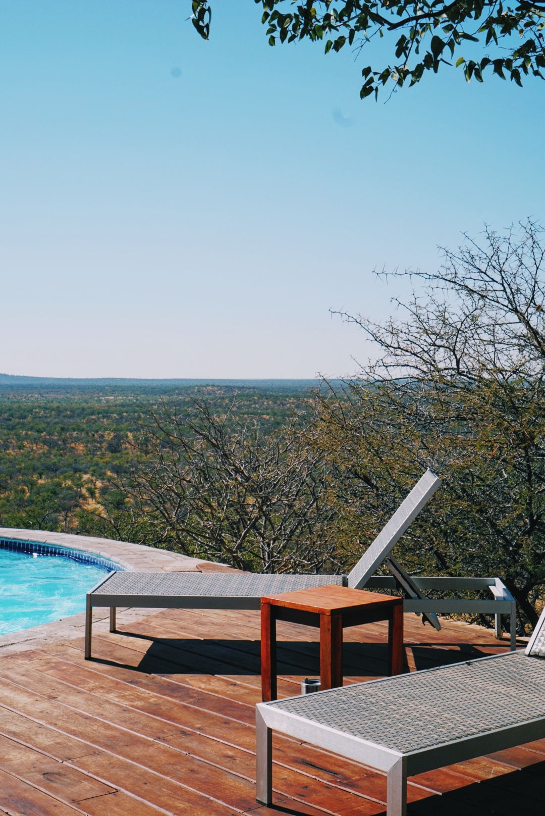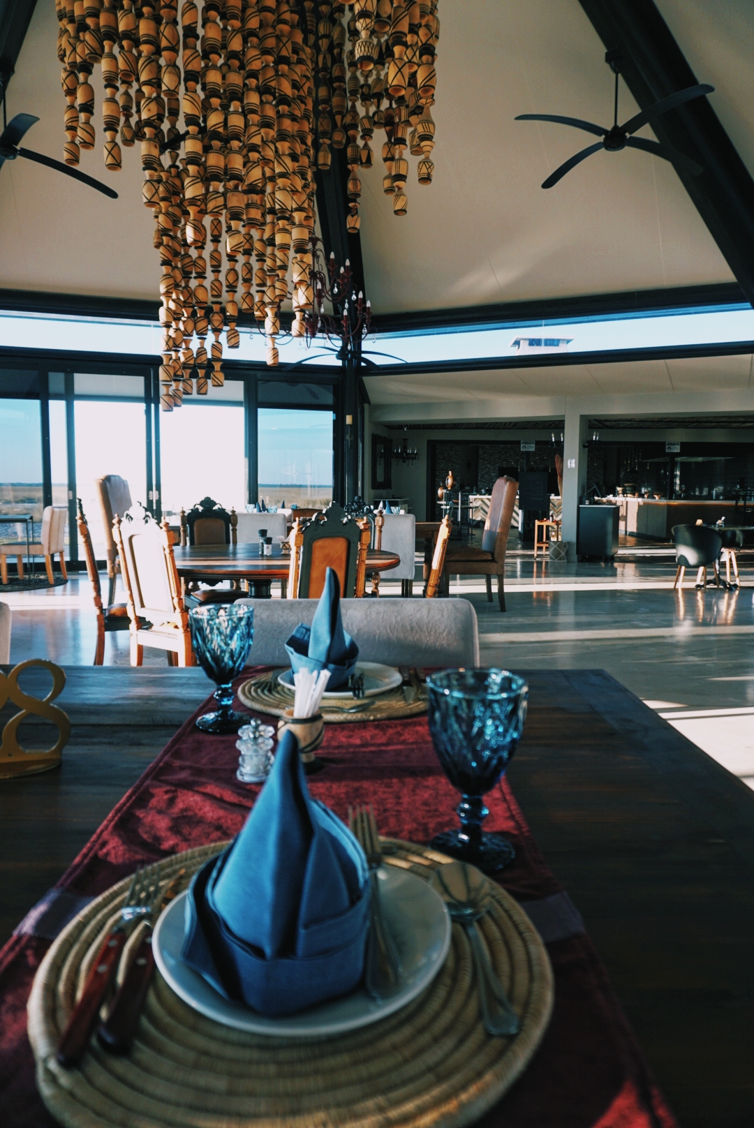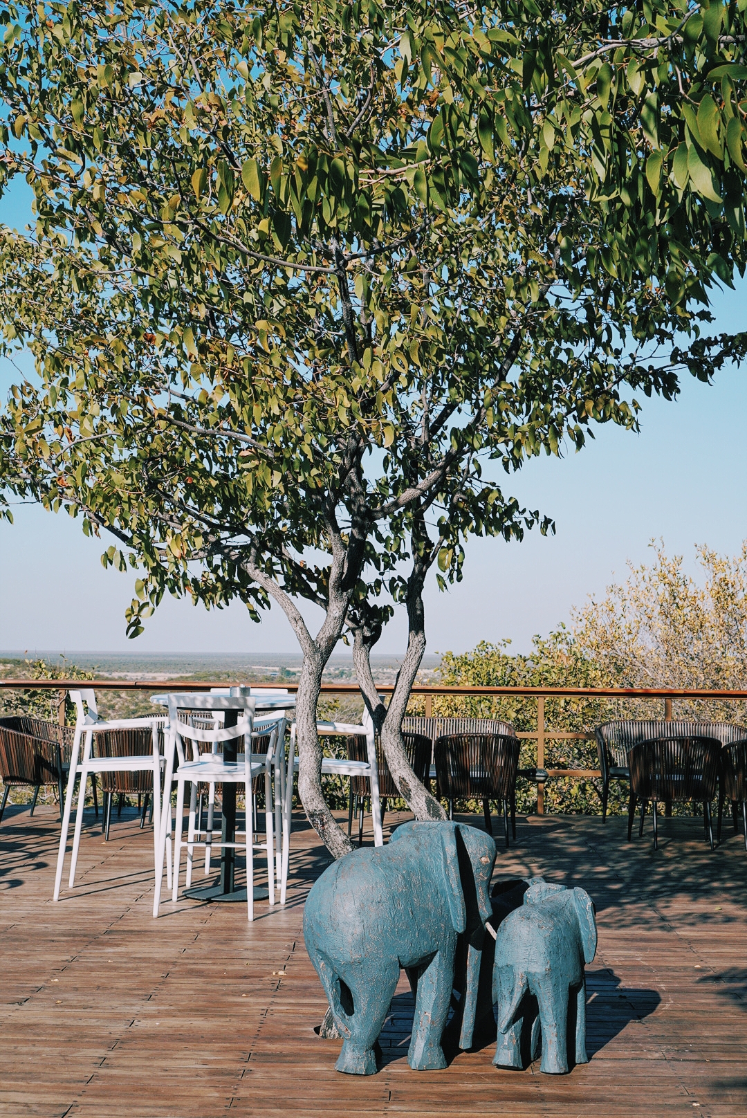 Ici la décoration est très lodge : cuir, bois, représentation d’éléphants mais sans que ce soit kitch. C’est sobre et très joli. L’atout principal de ce lodge c’est aussi cet incroyable deck en bois lié au restaurant depuis lequel les couches de soleil sont exceptionnels. Après une journée de safari se poser là c’est juste la cerise sur le gâteau !